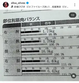 LiSAは「報告」として「右腕以外の筋肉量100%超えました」と投稿。体組成計の結果とみられる「部位別筋肉バランス」のプリント用紙の写真を載せ、左脚115.7%、胴体106.3%など右腕以外が100%を超えた様子を伝えた。