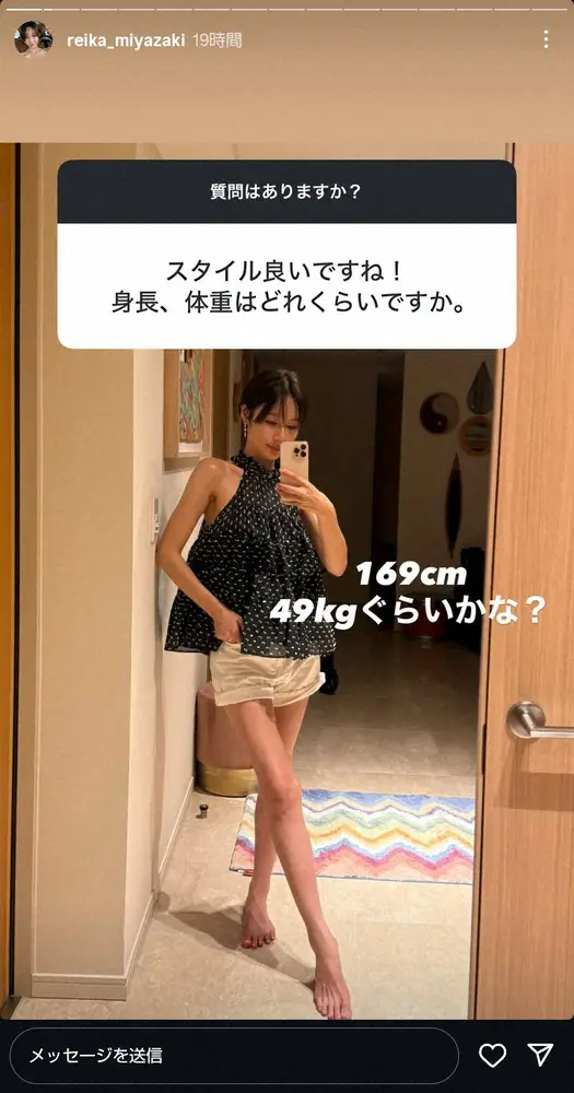宮崎はストーリーズの質問機能を使ってファンと交流。「スタイル良いですね!身長、体重はどれくらいですか」との質問に、「169cm 49kgぐらいかな?」と返信。ノースリーブのトップスにショートパンツを合わせた全身ショットを添えた。