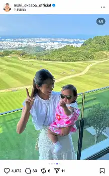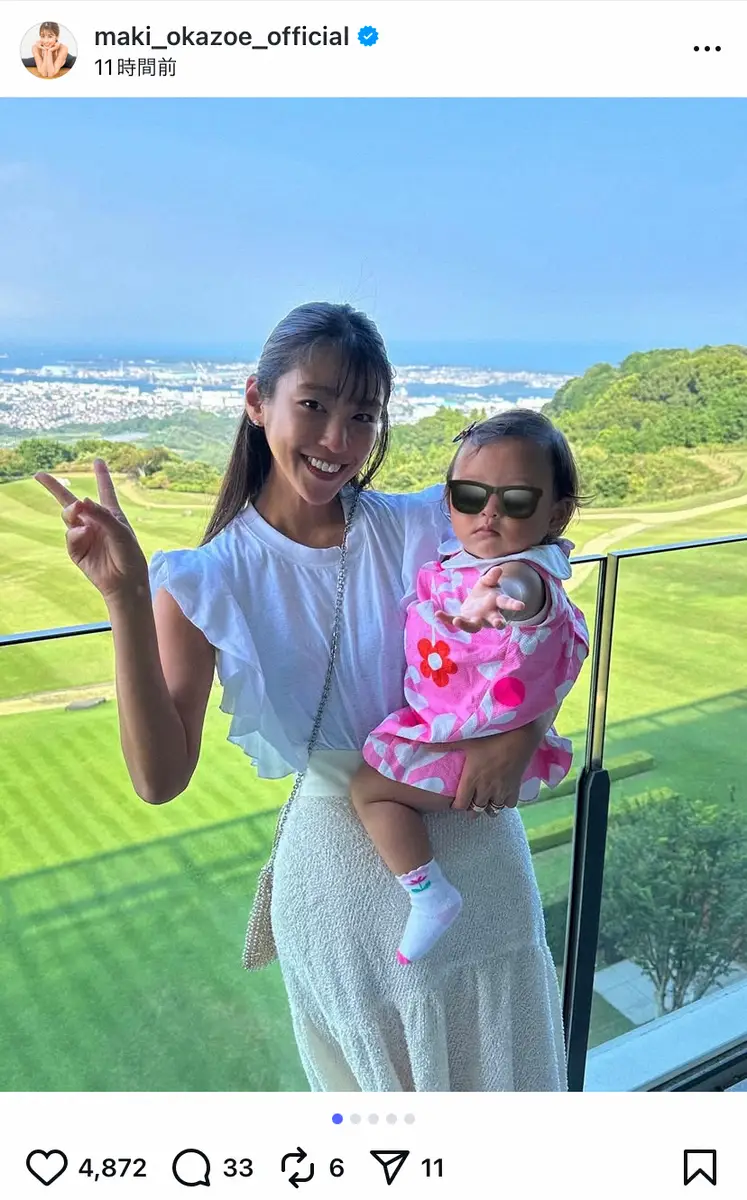 岡副は「先月のこと ちょうど2年前の夏に結婚式を挙げたホテルに宿泊してきました」と書き出すと、長女とのピースショットをアップ。「富士山と駿河湾を見渡せる景色に、芝生庭園、娘も大喜びで端から端まで歩き回っていました」と、はしゃぐ娘の動画も公開した。