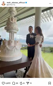 そして「思い出の場所に来られて幸せな時間でした」とコメント。夫でレーシングドライバーの蒲生尚弥とケーキ入刀をする様子を披露し、「5枚目は結婚式のときの写真 懐かしく、若い笑」とつづった。