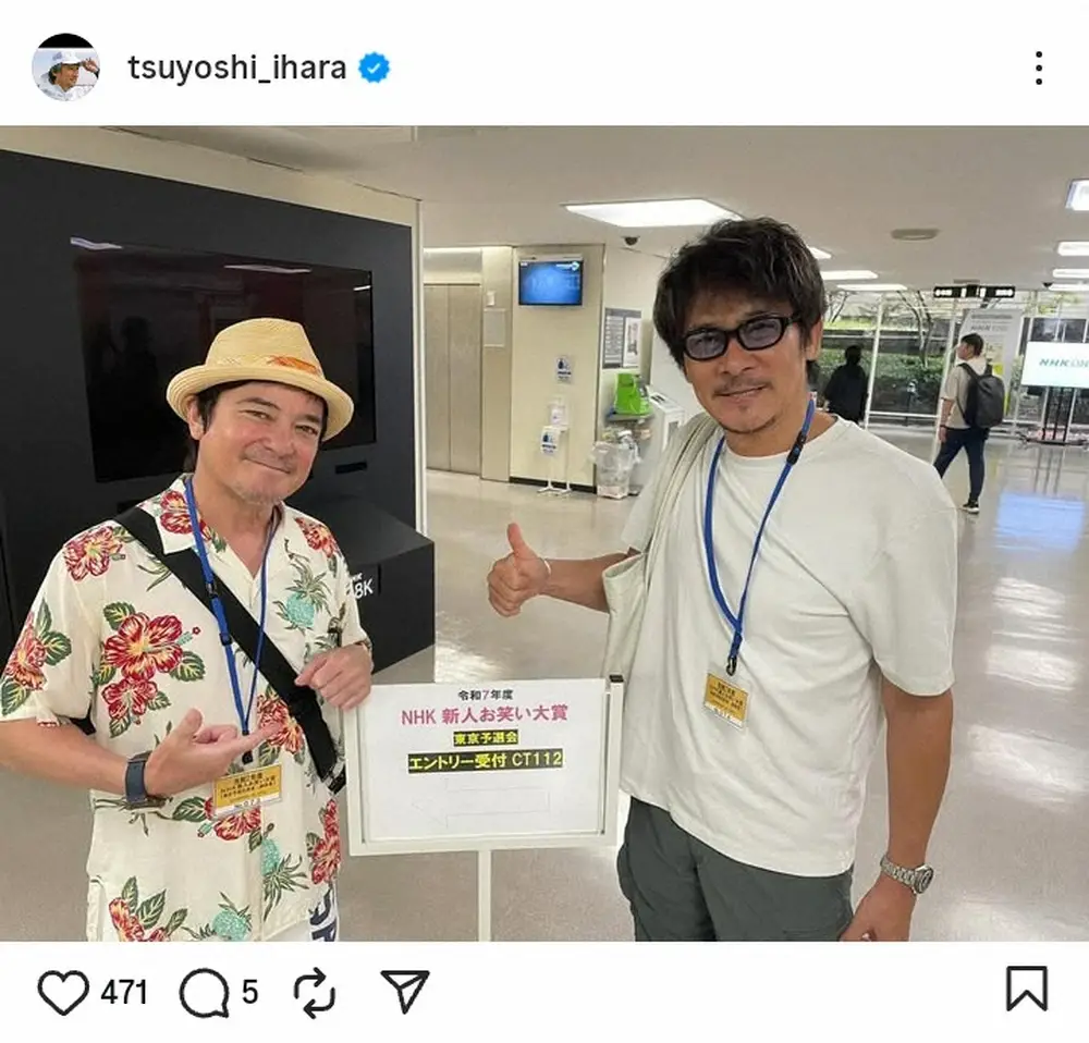 現在舞台公演中の伊原は「休演日にNHK新人お笑い大賞の予選」と報告。「新人賞なのにこんなおっさんが受けて良いんですか?『良いんです!』←これ つかみでした」と、相方・川平との2ショット写真を公開した。