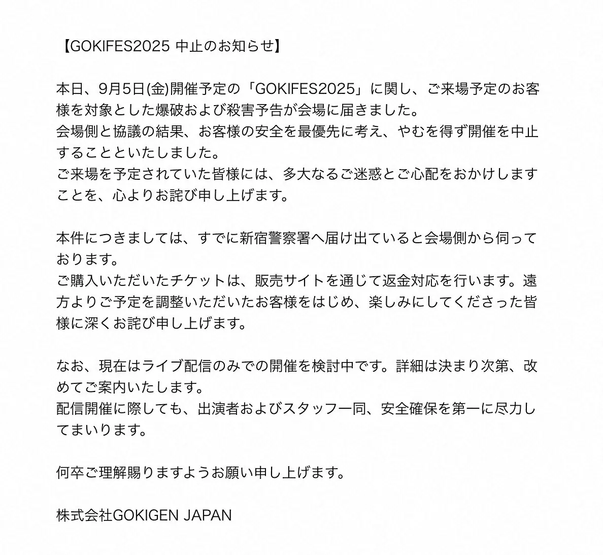 同SNSに「GOKIFES2025」主催者名義の声明が掲載され「本日、9月5日(金)開催予定の「GOKIFES2025」に関し、ご来場予定のお客様を対象とした爆破および殺害予告が会場に届きました。会場側と協議の結果、お客様の安全を最優先に考え、やむを得ず開催を中止することといたしました」と開催中止が伝えられた。