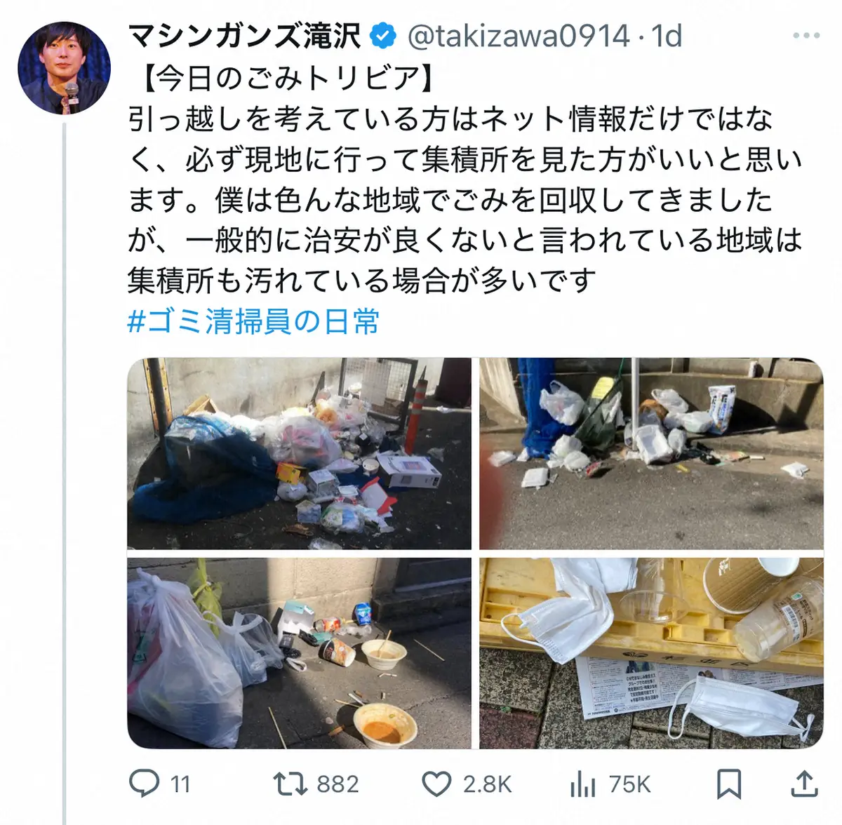 ごみ清掃員としても働くお笑いコンビ「マシンガンズ」の滝沢秀一(48)が4日までに自身のXを更新。引っ越しの際、見ておくべきポイントを挙げた。