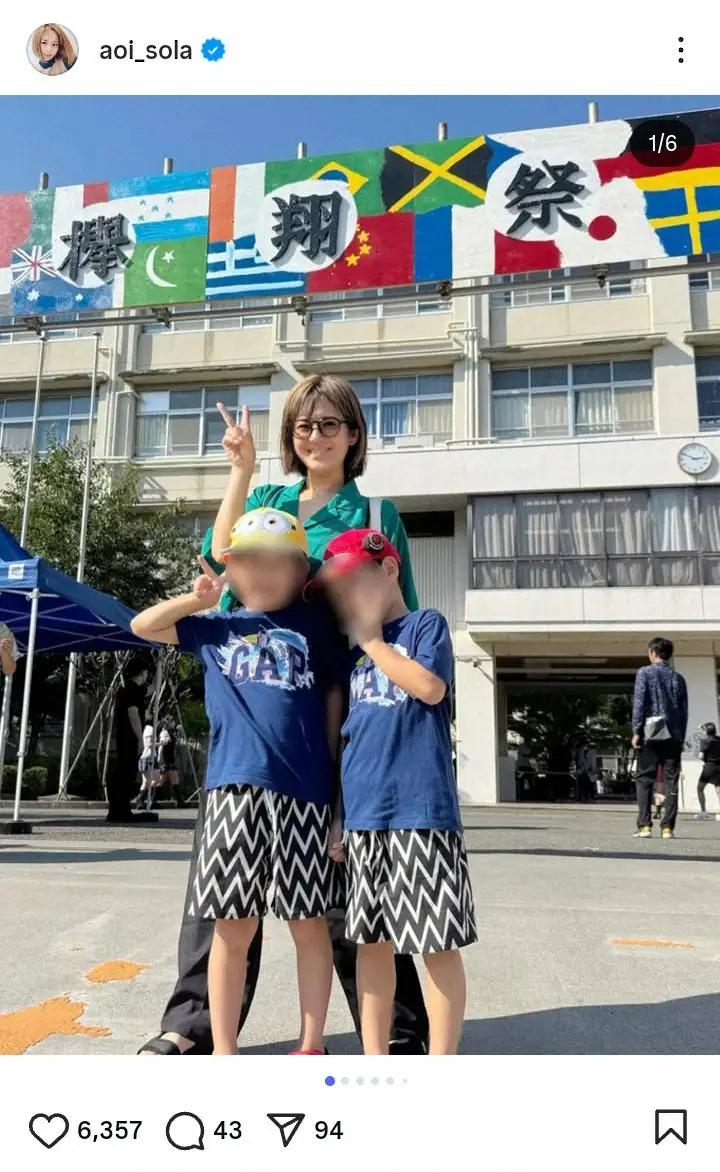 タレントの蒼井そらが7日までに自身のインスタグラムを更新。6歳の双子の息子との親子3ショットを披露した。