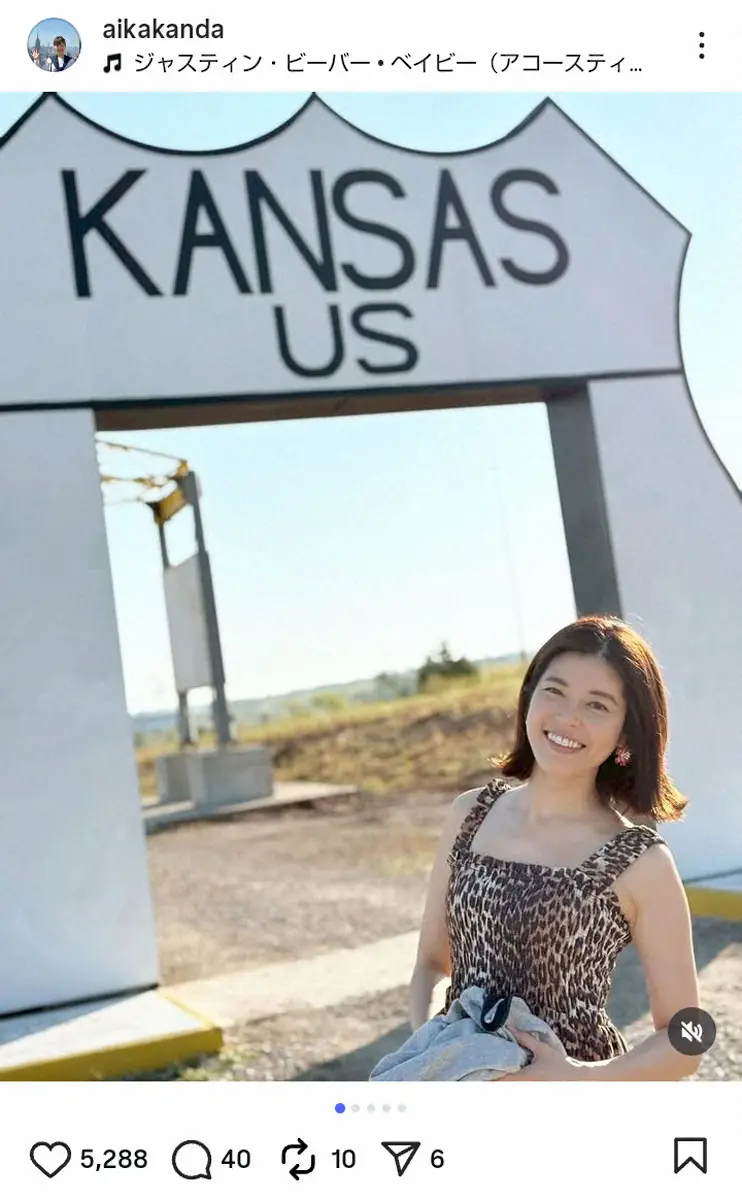 この日は、カンザス州での写真を投稿。「映画『カーズ』を見てから行って良かった」と映画『カーズ』の世界を満喫したことを報告。ヒョウ柄のワンピース姿も披露し、「アメリカの空には、やっぱりヒョウ柄が合うぅぅ」とつづった。ハッシュタグでは「カンザス州」「カーズ」などと付け加えた。