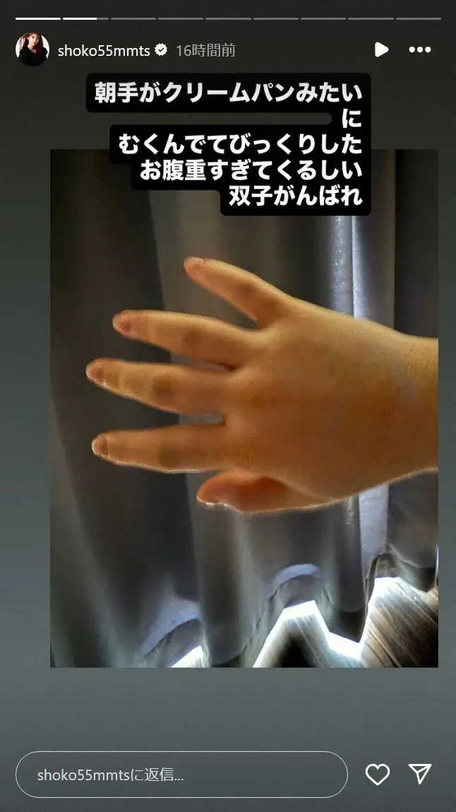 中川翔子インスタグラム(@shoko55mmts)から 中川翔子 双子妊娠34週超え悲鳴「ギリギリ限界感じてます」 帝王切開前… ギャラリーで見る この記事のフォト 2025年09月08日の画像一覧 もっと見る 2025年09月08日の画像をもっと見る