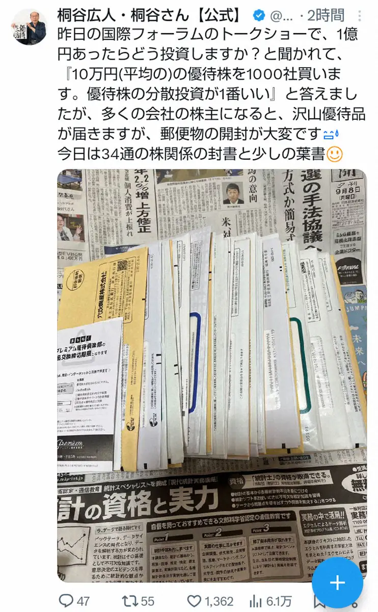 桐谷広人さん Photo by スポニチ 桐谷広人さん 所持株の大幅値上がり報告 1億円あったらどう投資?にアイ… ギャラリーで見る この記事のフォト 2025年09月08日の画像一覧 もっと見る 2025年09月08日の画像をもっと見る
