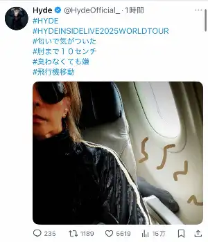 この日、機内で撮影した自撮り写真を1枚投稿。「#HYDE」「#HYDEINSIDELIVE2025WORLDTOUR」「#匂いで気がついた」「#肘まで10センチ」などのハッシュタグを添えていた。