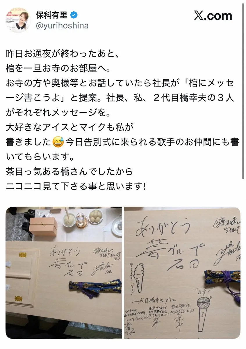 橋さんの棺と思われる写真を投稿。棺には各々の橋さんへの思いが手書きでつづられている。「昨日お通夜が終わったあと、棺を一旦お寺のお部屋へ。お寺の方や奥様等とお話していたら社長が『棺にメッセージ書こうよ』と提案」があったという。