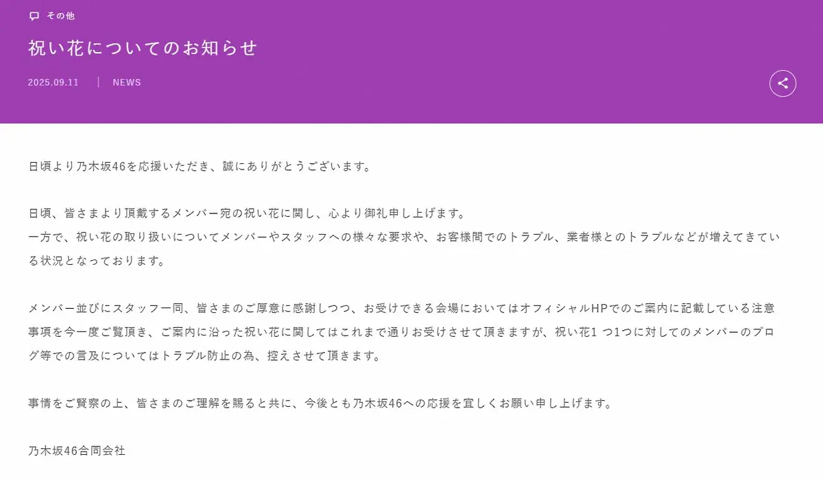 乃木坂46は11日に公式サイトを更新し、ファンからの「祝い花」に関する声明を発表した。