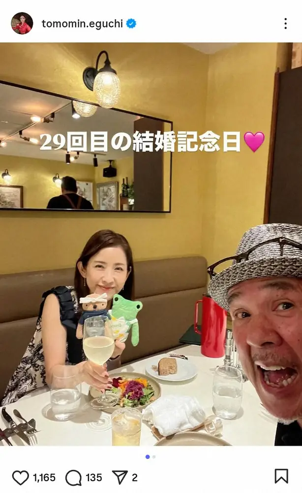 お笑いタレント・つまみ枝豆(67)の妻でタレントの江口ともみ(57)が12日までに自身のインスタグラムを更新。29回目の結婚式記念日を祝ったことを明かした。