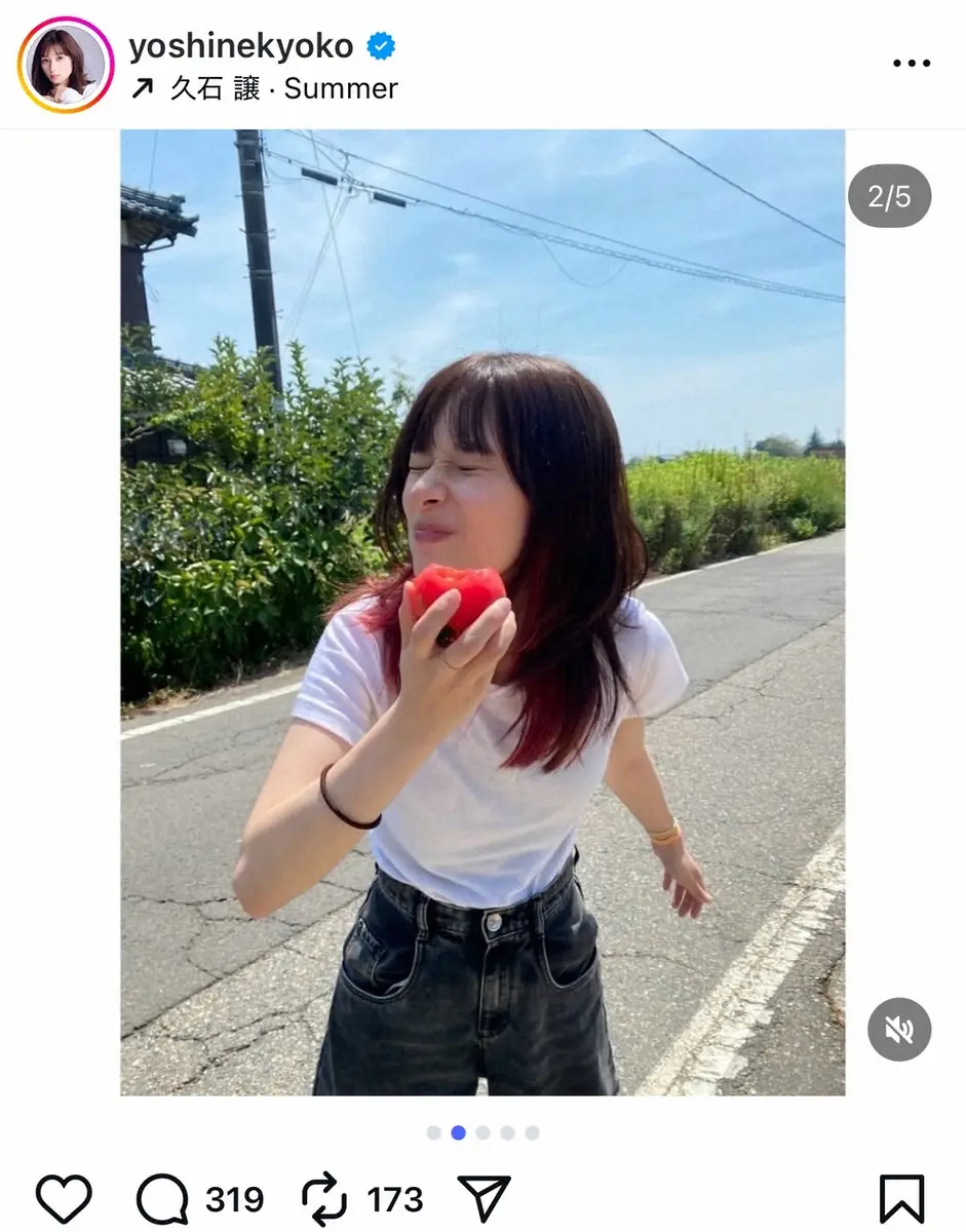 さらに投稿では、花火の写真に加えて、青空の下でトマトを丸かじりする無邪気な姿も見せた。
