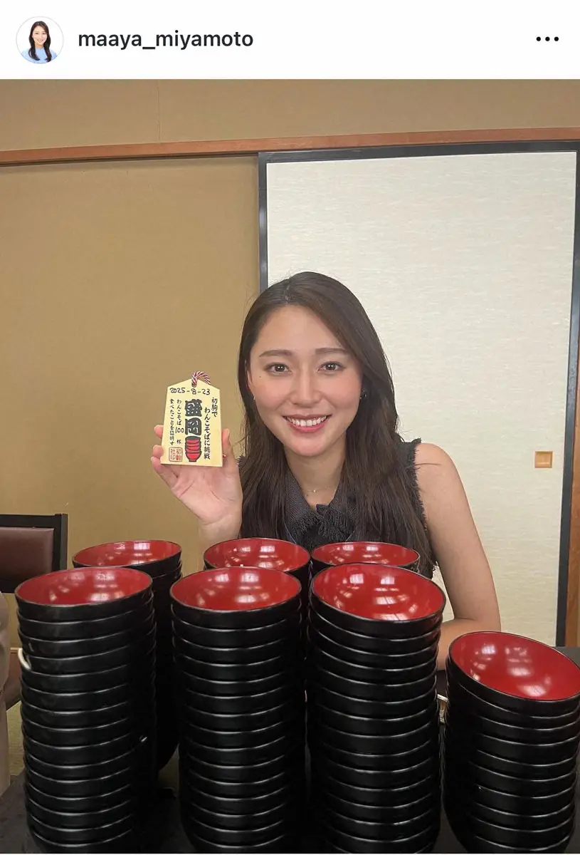 フジテレビの宮本真綾アナウンサー(23)が15日までに自身のインスタグラムを更新。わんこそばで100杯を達成したショットを投稿した。