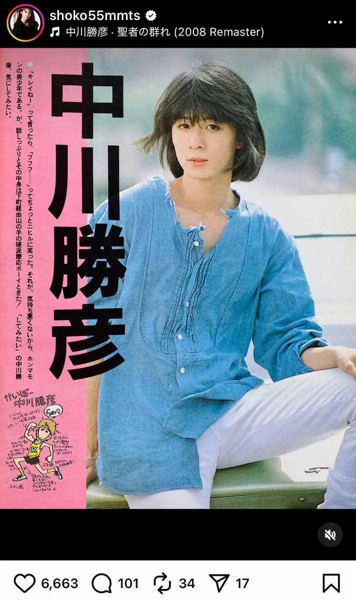 中川は「9/17 今日は父 中川勝彦の31回目の命日 あの日夕方5時ごろ父は旅立ちましたが大きな虹が出ていました あの頃まだわたしは幼かったけど時を重ね 父が一番話したい人になりました」と報告。元歌手の父の生前の写真を投稿した。