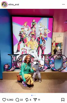 また、パネルでの親子ショットを投稿し、「入り口でしっかりジョジョ立ちをきめてくれた息子に救われました(でも絶対にリベンジする!今度は大人だけかも!)」とコメント。「予定変更で、水族館に行ってイルカショーを楽しむことに こちらも賑わっていましたが、1時間前からスタンバイすれば席で見られます!笑」と記し、スタンド席での3ショットを披露した。