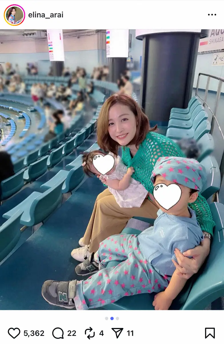 フリーアナウンサーの新井恵理那(35)が18日、自身のインスタグラムを更新。1歳の長男、4カ月の長女と水族館に行ったことを報告した。