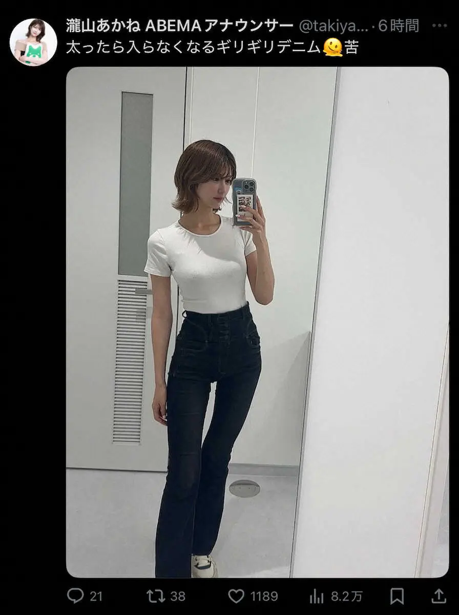 ABEMAの瀧山あかねアナウンサー(31)が20日までに自身のSNSを更新。ギリギリのデニムコーデを投稿した。