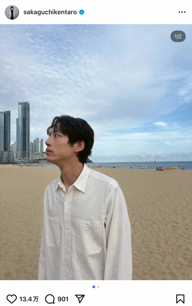 坂口は、白いシャツを着た自身が浜辺でたたずむ写真をアップ。「釜山国際映画祭、『盤上の向日葵』ありがとうございました」とし笑顔と力こぶの絵文字を添えた。