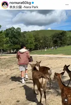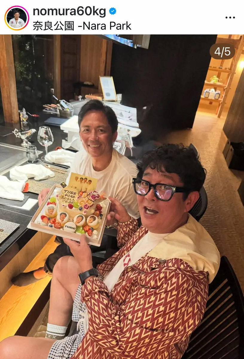 「前田さんとのプライベート時間も最高でした」と記し、ボーカルの前田亘輝との奈良でのプライベートショットをアップ。鹿とのスリーショットもあり、「#TUBE」「#前田亘輝」「#奈良」「#鹿」「#笑ってすみません」「#野村忠宏」と添えた。
