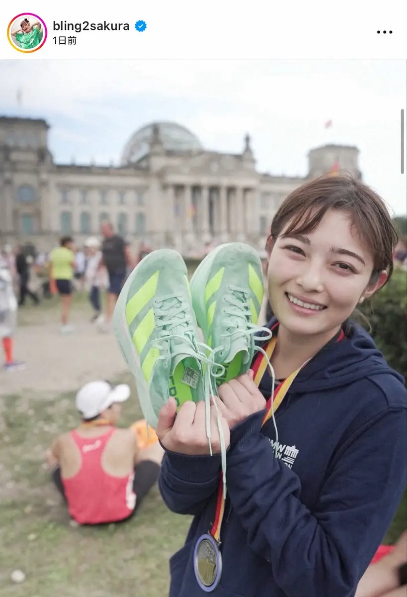 古風な街並みを背景に、ランニングシューズを持ち笑顔のショットなど複数枚の写真を投稿し「ベルリンマラソン、3時間25分51秒で完走しました!」と報告。