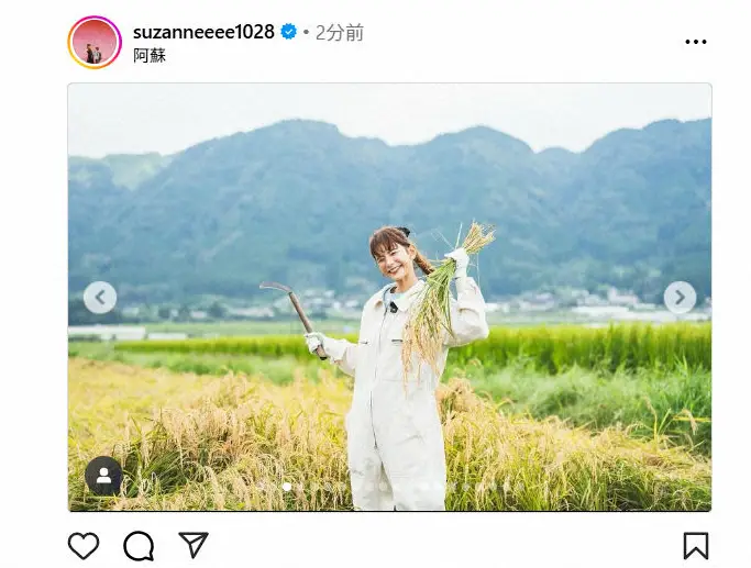 タレントのスザンヌ(38)が23日、自身のインスタグラムを更新。今年度から地元・熊本県で田植えに挑戦していたが、このほど稲刈りを行ったことを報告した。