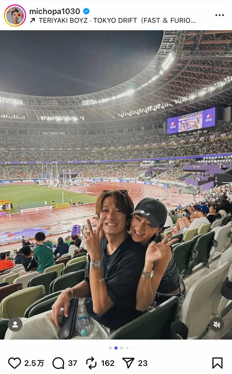 みちょぱは「東京2025世界陸上 DAY8、DAY9会場で観戦できました」と書き出すと、夫でタレントの大倉士門と寄り添う2ショットを公開。「2年に1回のこの期間毎回寝不足になりながら テレビから応援しててやっとの東京開催!!」と世界陸上の大ファンであることを明かし、「あの歓声を生で感じて一緒に参加できて最高でした」と熱い思いをつづった。