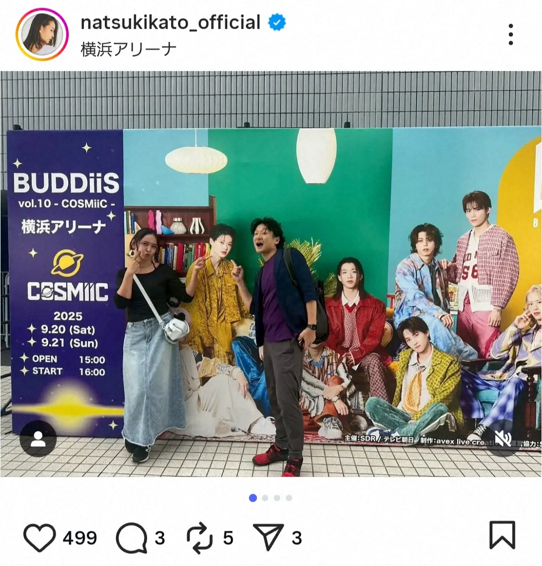 加藤は「#BUDDIIS横浜アリーナ に映画制作メンバーといってきました!ご挨拶できたのですがメンバーとのお写真は撮れなかったのでパネルで 私のお気に入りの曲も流れてとても楽しい時間を過ごせました!」とつづり、映画「冤罪の作り方」で共演する9人組ダンス&ボーカルグループ「BUDDiiS(バディーズ)」のFUMINORIこと小川史記(30)が出演する横浜アリーナで開催したライブに参戦したことを報告。デニムスカートに黒トップスの“シンプルスタイル”に身をつつみ、大きなパネルの前で撮影したショットをアップした。