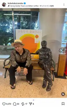 そして「こんなに宮崎を愛してるのに俺たちの銅像どこだよ。地雷みたいに撤去して、、ほんまに」と、かつて設置されていた自身の銅像についてコメント。宮崎ブーゲンビリア空港の記念撮影スポット「ぬくぬくひなたベンチ」に腰掛け、同県出身の俳優・温水洋一の銅像との写真も公開した。
