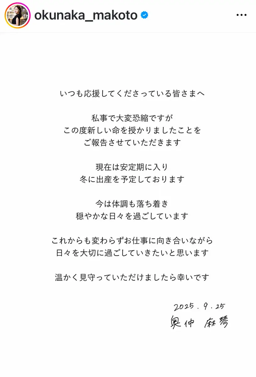 奥仲麻琴インスタグラム(@okunaka_makoto)から 奥仲麻琴 第1子妊娠を発表 すでに安定期 今冬出産予定「体調も落ち着き… ギャラリーで見る この記事のフォト 2025年09月25日の画像一覧 もっと見る 2025年09月25日の画像をもっと見る