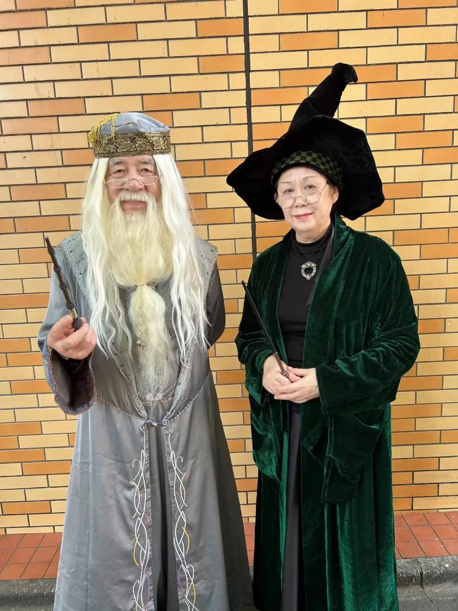 長い白髪に荘厳な髭をたくわえた姿は、魔法界を導く名校長そのもの。手にした杖には確かな重みと品格が宿る。注目すべきは、隣に並ぶマクゴナガル先生に扮(ふん)した女性。実は、異世界おじいちゃんさんの妻だという。