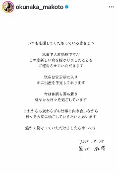 奥仲は「いつも応援してくださっている皆さまへ これからも温かく見守っていただけますと幸いです」と記し、直筆署名入りの文書を投稿した。
