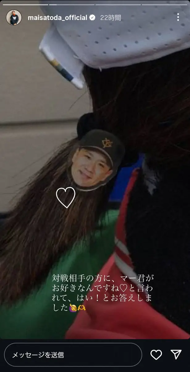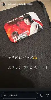 次のストーリーズでは、カバンに着けられたと思われる田中投手のバッチの写真をアップし「至る所にグッズ 大ファンですから!!!」とハートの絵文字を添えてつづり、夫婦の仲の良さがうかがえる投稿にSNSで反響が多く寄せられた。