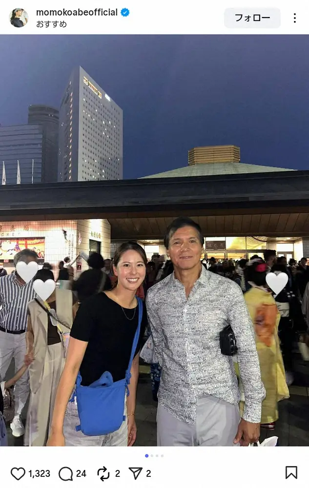 桃子は「父と大相撲観戦」と書き出し、国技館前での父・祐二との2ショットをアップ。「父は幼少期から相撲が大好き!とても詳しくて、色々教えてくれました」と伝えた。