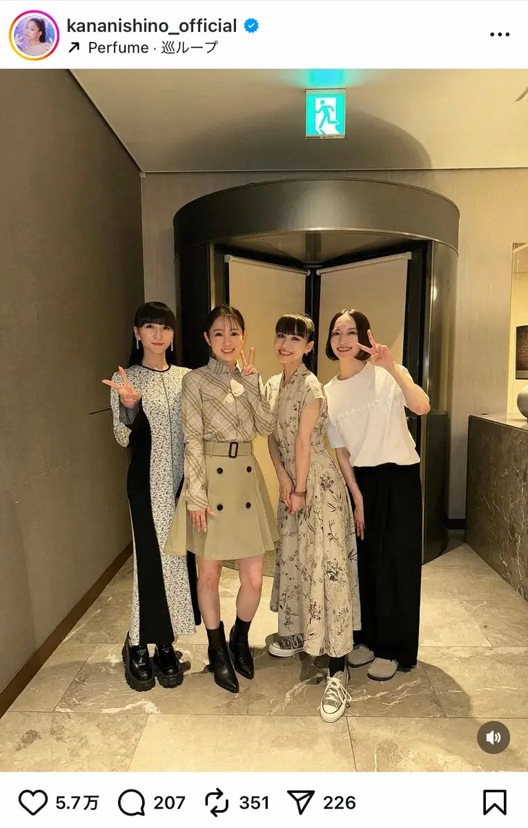 歌手の西野カナ(36)が25日、自身のインスタグラムを更新。年内で活動休止を発表したテクノポップユニット「Perfume」との4ショットを公開した。