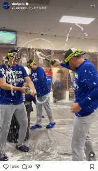 ドジャースは25日(日本時間26日)、球団公式インスタグラムを更新。4年連続地区優勝を決めた試合後のシャンパンファイトの様子を公開した。