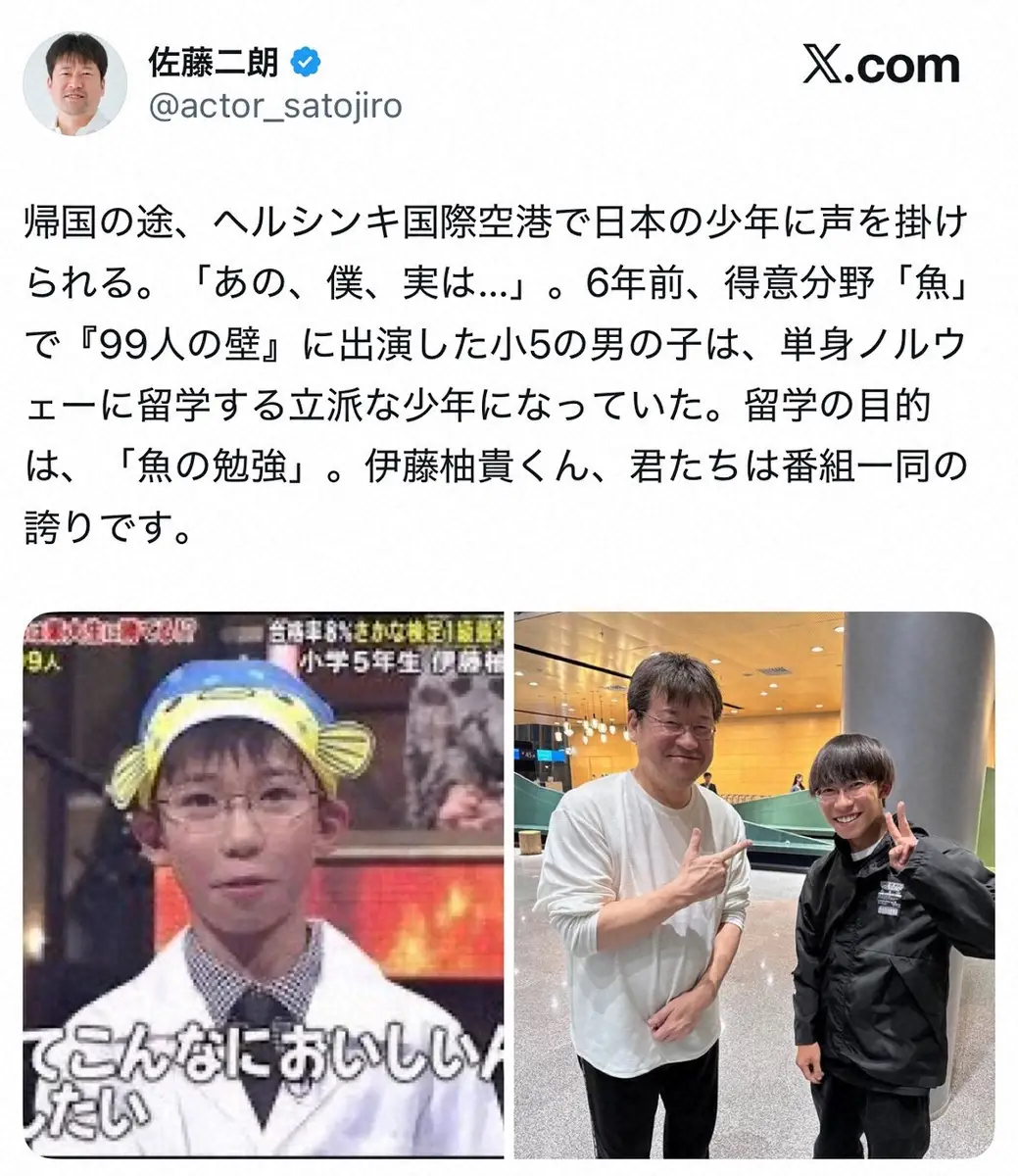 「あの、僕、実は…」と声をかけてくれた少年の正体について「6年前、得意分野『魚』で『99人の壁』に出演した小5の男の子は、単身ノルウェーに留学する立派な少年になっていた」とつづり、「留学の目的は、『魚の勉強』。伊藤柚貴くん、君たちは番組一同の誇りです」と称えた。