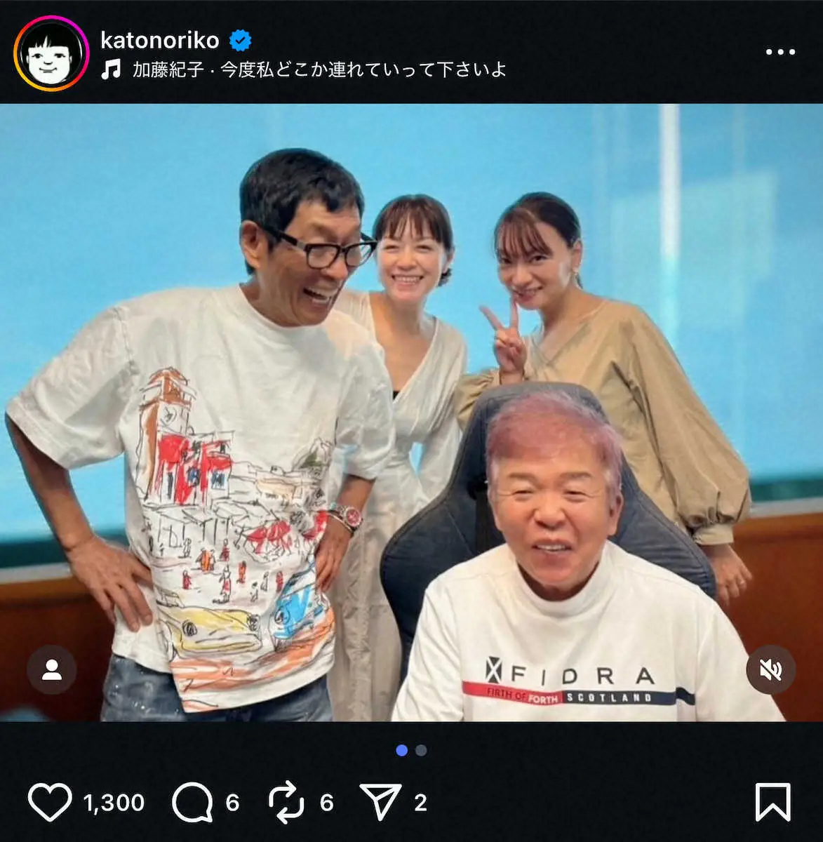 女優の加藤紀子(52)が29日までに自身のインスタグラムを更新。MBSラジオ「ヤングタウン」に出演した際の豪華4ショットを投稿した。