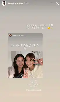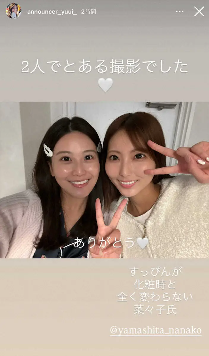 自身のインスタグラムストーリーズで「2人でとある撮影でした」と福岡出身のタレント山下七子との“すっぴん”2ショットを公開した。