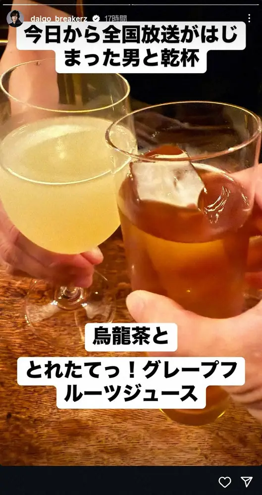 DAIGOのインスタグラム(@daigo_breakerz_)から 青木源太アナ「時々この時間に誘って来る先輩がいる」深夜の仲良し“乾杯シ… ギャラリーで見る この記事のフォト 2025年09月30日の画像一覧 もっと見る 2025年09月30日の画像をもっと見る