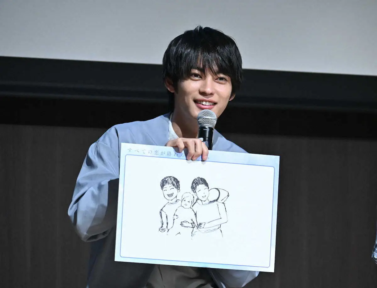テレビ朝日系ドラマ「すべての恋が終わるとしても」制作発表で自身が書いた絵を披露する神尾楓珠