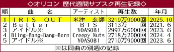 シンガー・ソングライターの米津玄師(34)の「IRIS OUT」がオリコン週間ストリーミングランキングで2週連続1位となることが30日、確定した。1週間のサブスクリプション(定額聴き放題)の再生回数は3219万9000回。世界的人気の韓国グループ「BTS」が2021年6月に「Butter」でマークした3113万回を超え、史上最多記録を打ち立てた。