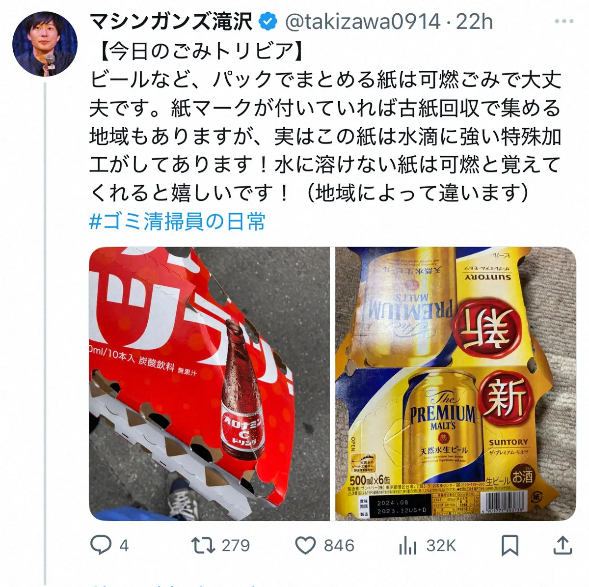 滝沢は「【今日のごみトリビア】」とし「ビールなど、パックでまとめる紙は可燃ごみで大丈夫です」と呼びかけ。缶ビールの紙パッケージの写真を添えた。