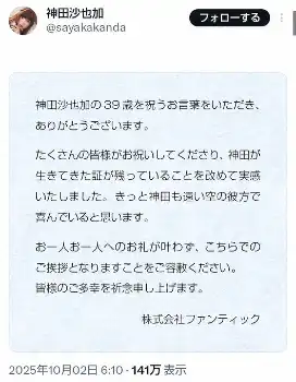 所属事務所・ファンティックの名義で「神田沙也加の39歳を祝うお言葉をいただき、ありがとうございます」と感謝。「たくさんの皆様がお祝いしてくださり、神田が生きていた証が残っていることを改めて実感いたしましたきっと神田も遠い空の彼方で喜んでいると思います」と記した。