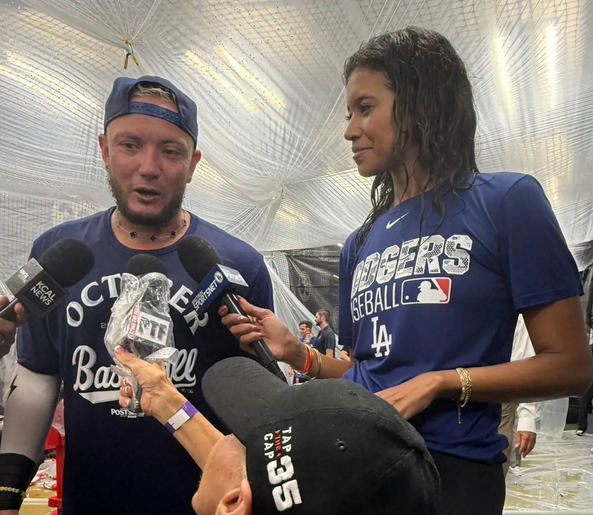 地元局「スポーツネットLA」のリポーター、キルステン・ワトソンさんは、リーグ優勝を決めた9月25日のダイヤモンドバックス戦でもシャンパンファイトを体当たり取材。前回も取材中にドジャースナインから勝利の美酒をかけられて悲鳴を上げていたが、この日もシャンパンファイトであっという間にびしょ濡れとなりながらロハスらナインに取材を行った。