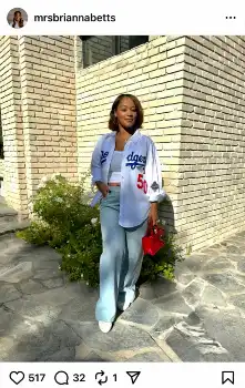ブリアンナ夫人は青字で「Dodgers」、赤字でベッツの背番号「50」が入ったユニホーム風の襟付き白シャツにデニム姿という爽やかな服装を披露した。