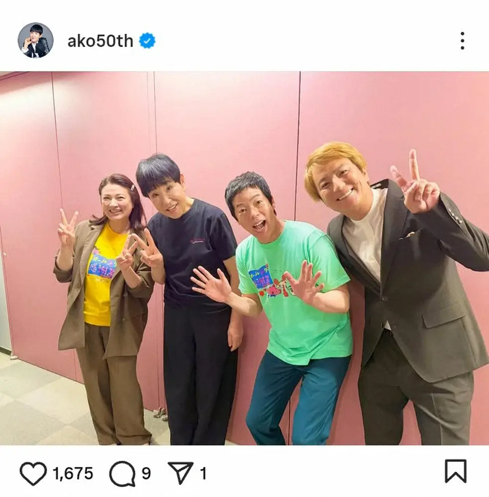 「生放送終わって楽屋の前で、ばったり会いました」と書き出すと、自身とタレントの島崎和歌子、お笑いタレントの今田耕司、俳優の上地雄輔の4ショットをアップ。