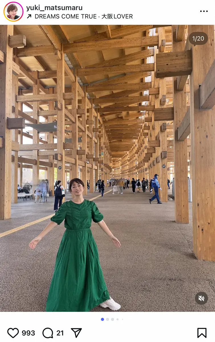 松丸アナは「少し前ですが万博に行ってきました」と大屋根リングの下で緑のワンピースを着た自身の写真などを添えて報告。