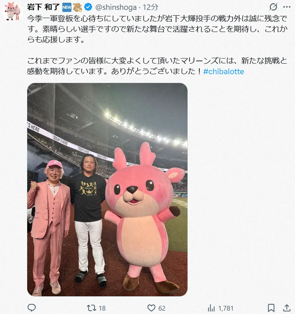 岩下社長は岩下、岩下の新生姜公式キャラクター「イワシカちゃん」とのスリーショットを公開。「今季一軍登板を心待ちにしていましたが岩下大輝投手の戦力外は誠に残念です。素晴らしい選手ですので新たな舞台で活躍されることを期待し、これからも応援します」とエールを送った。