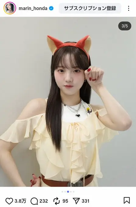 「キツネチームでした」とつづった本田。ふんわりとしたオープンショルダーのブラウスときつね耳のカチューシャを身につけたショットを披露し「うれしい」と添えた。