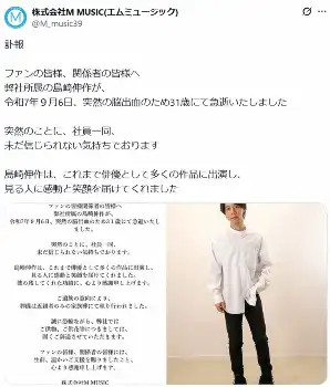 事務所「M MUSIC」はXで「訃報」ファンの皆様、関係者の皆様へ」とし「弊社所属の島崎伸作が、令和7年9月6日、突然の脳出血のため31歳にて急逝いたしました」と公表した。